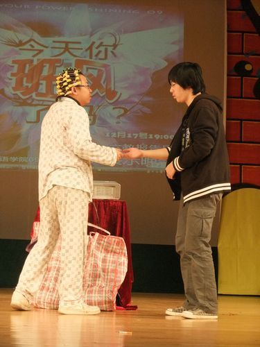 法英11班和商管1班的情景剧《爱情买卖》主演从观众席跑上舞台的出场方式引来观众一浪高过一浪的欢呼。他们续演三下乡总结大会中的反串节目,给观众带来又一匠心独运的情景剧表演。满头卷发的包租婆形象、令人捧腹的台词、夸张的神情动作再度成为全场焦点。