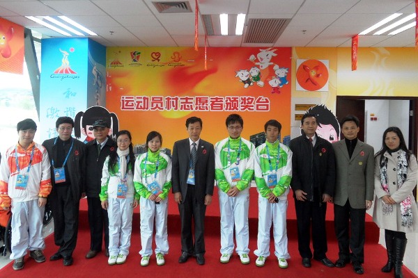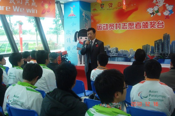 许国彬代表学校,向同学们表示慰问,并对志愿者们的工作予以了高度评价,他说志愿服务既是平凡的工作,也是伟大的事业,并以法国留学的亲身经历为例子,鼓励同学们抓住服务亚运会、亚残运会这一历史性的实践机会,多看、多琢磨、多总结,把实践行动转化为自身宝贵的人生经验和财富,并题词勉励同学们:“志愿服务,美丽人生!
