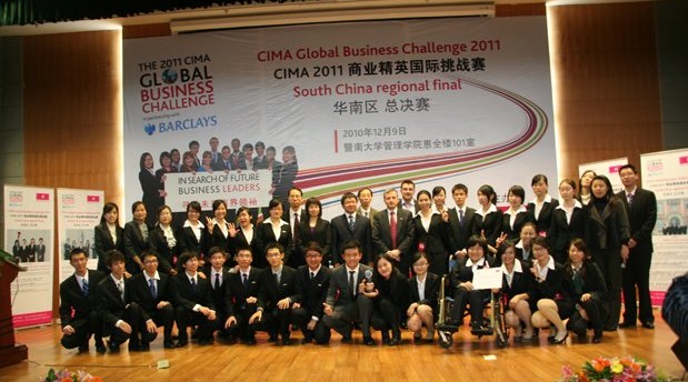 本网讯 近日,由CIMA皇家特许管理会计师公会发起的“CIMA商业精英国际挑战赛”华南区决赛在暨南大学管理学院落下帷幕,由我校商英学院学生黄一维、周嘉佳、邝颖怡、许觉晓、钟妙组成的“Illuminator”团队代表我校参赛。经过一番角逐,团队力压来自厦门大学、中山大学、暨南大学、湖南大学和汕头大学的参赛队伍,获得华南区冠军。他们将于2011年4月与其他四大赛区的冠军队伍在上海角逐中国区总冠军,争夺国际总决赛资格,与来自香港、马来西亚、印度、英国、爱尔兰等国家和地区的冠军队伍一决高下。