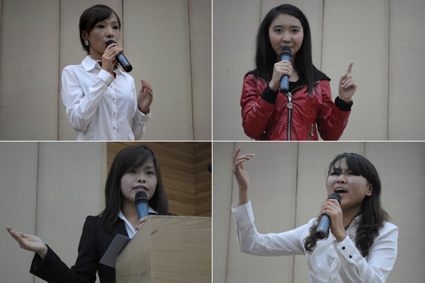 而特写文朗诵环节各选手平分秋色。7班选手独具匠心,在朗诵《Between Black and White》时,创造性地将美国著名的电视节目《60分钟》 “山寨”成《10分钟》,为观众细致地分析了在黑与白之间的“灰色心理”和“灰色技能”,如跳舞、唱歌、打麻将等,表现出交际能力在求职生涯中的重大作用。6班和9班选手的话题则更加贴近生活,分别以亚运志愿(《Voluntary or Forced》)和“出国热”(《¥400,000 in Exchange for ¥4000》) 引发的某些社会问题的深思,现场版的面对面采访别出心裁。5班的《Here Comes Himono Onna》以独特视角再看宅女,呼吁社会包容关心这一群体;11班的《Here Comes Ant-like Superman》通过讲述“蚁族”的感人经历,“文凭换饭盒”的安插更是独具匠心。