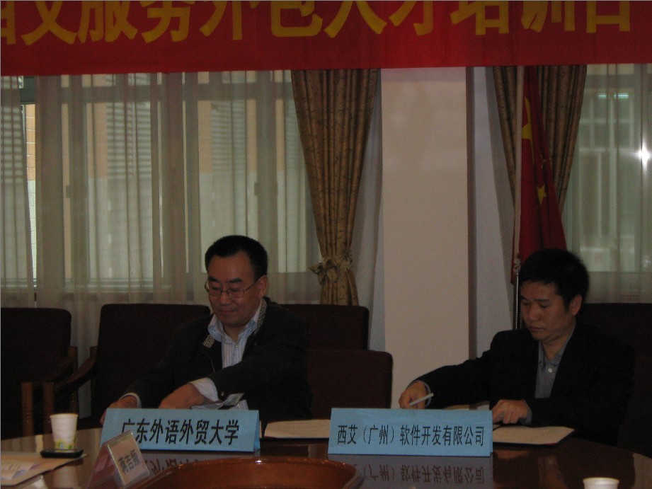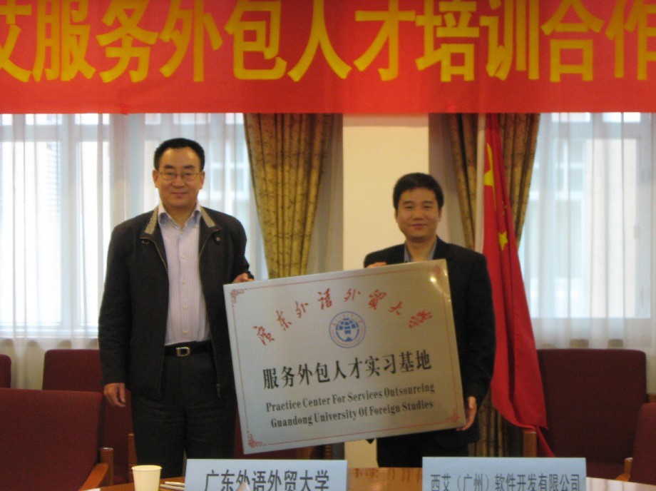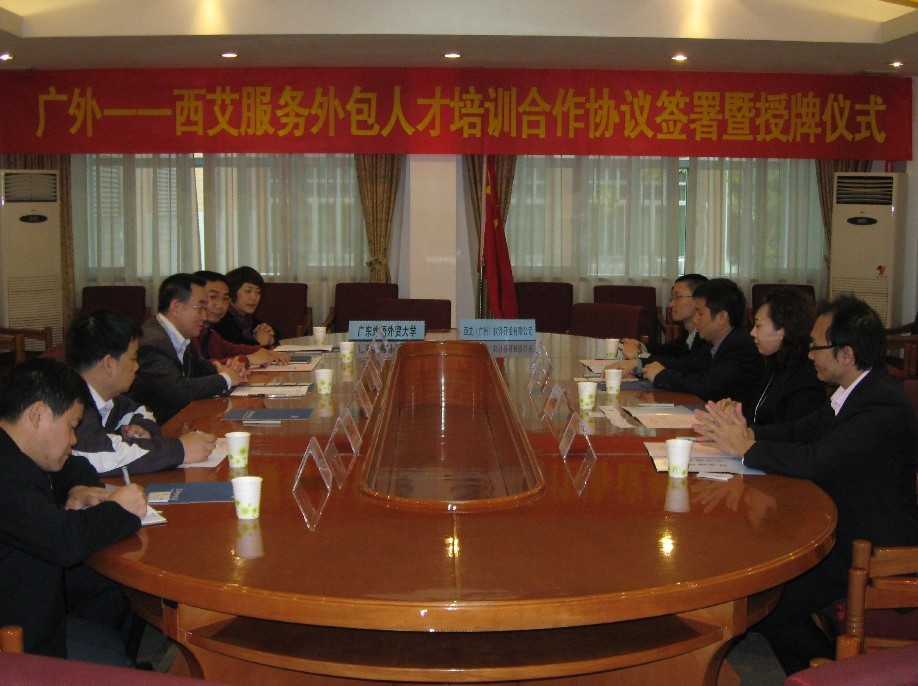 本网讯 12月10号上午,在广外北校区行政楼第三会议室隆重举行我校与西艾(广州)软件开发有限公司服务外包人才培训合作签约授牌仪式。即西艾(广州)成为广外的服务外包人才实习基地,广外成为西艾(广州)服务外包人才培训基地。