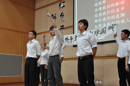 紧接着进入“经典演绎”环节,入围决赛的六支队伍均表现不俗。国贸085班学生党支部与国贸09第一学生党支部选取相同书目《中国共产党抗日英雄传》,从不同角度构建出吉鸿昌有血有肉的的英雄形象;金融083班学生党支部借一部《恰同学少年》生动地表现了少年毛泽东的爱国热情;一本《红岩》,一曲《红梅颂》,经济082学生党支部通过朗诵和歌唱的方式,歌颂了革命志士刘思扬和江姐不屈的革命精神;国贸086班学生党支部一幕《惊天动地战汶川》讲述了地震大灾中那些感人至深的瞬间;国贸081班学生党支部一部《遥远的天堂》展现着那些驻守雪山边关的军人们的铁骨柔情。