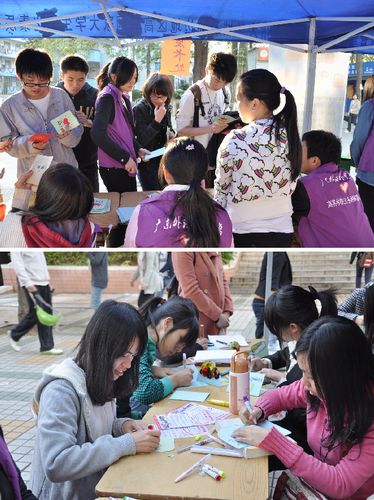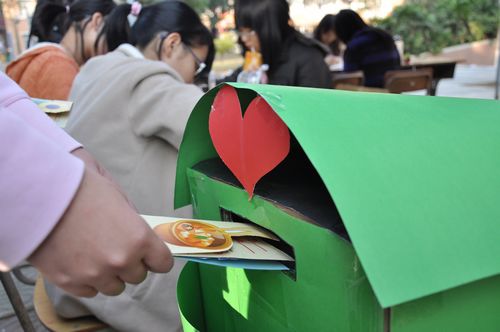 现场气氛热闹而又温馨,小小卡片,心意几许。同学们认真地填写手上的卡片,在纸上流泻同窗谊或师生情,填充自己满满的谢意和祝福,然后将卡片投递到商英志协手工制作的邮筒里,等待志愿者邮差们将他们的卡片送达。下午5时整,400多张被一扫而空,感恩邮差摊宣活动圆满落幕。