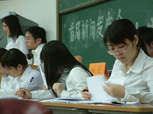 首场模拟新闻发布会,由新闻041班新闻发言人组对阵新闻052班记者组。扮演教育部新闻发言人角色的新闻041班首先就“高校乱收费”的主题进行了新闻发布。提问环节一开始,云集新闻052班的新浪网、香港无线、人民日报等各大媒体的“记者” 纷纷上阵,对新闻发言人进行了连番提问。随后在记者组新闻052班撰写编辑稿件的同时,评委高坚老师列举了一些问题,如发布内容中有新闻价值的材料和新闻事实不够充分等。