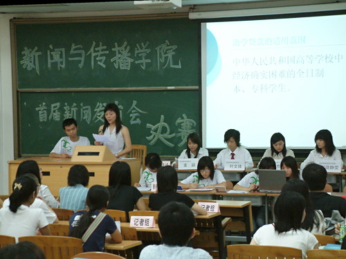 第二场决赛,由新闻031班记者组对阵05广告班新闻发言人组。发布会解读了“高校国家助学贷款新政策”。大三的同学在此环节发问时从容镇定。05广告班叶文臻同学的英文回答条理清晰且切中要点。