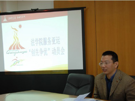 本网讯 12月3日上午,我校法学院“服务亚运 创先争优”总结暨“服务亚残会”动员大会在院系楼401室顺利举行。学院党委副书记卢海清、各年级辅导员老师、各年级志愿者代表、学院交通服务队代表参加了会议。会上志愿者代表踊跃发言,谈了在服务亚运、创先争优过程中的经历与感悟,表达自己对参加广州亚残会、服务好亚残会的热情和期盼。