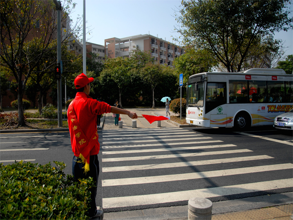 不同于志愿前线的志愿者和他们背后的志愿者,有一群人身穿红色队服,身配绶带,手执小红旗,守在大学城中环的马路边,为亚运服务,也为众多的广外师生服务,他们就是法学院志愿交通服务队的成员。交通服务队由法学院各学术党支部组建,至今已工作三个星期。亚运期间,交通服务队除了指挥交通外,还充当“活地图”,为路人指路。