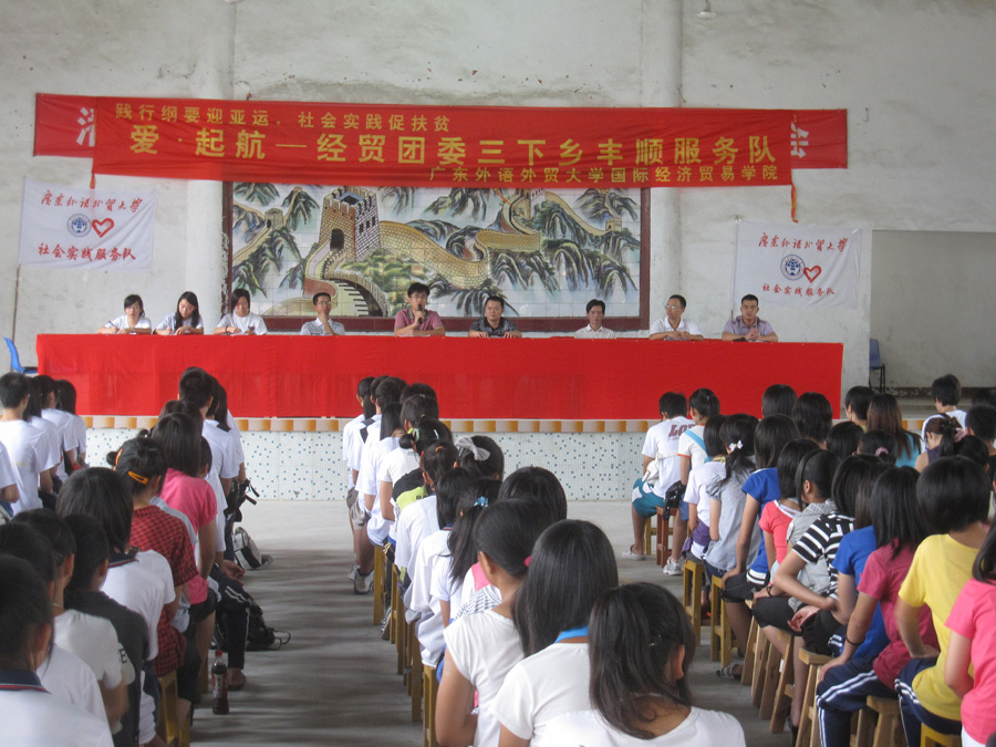 本网讯 7月21日上午8点30分,经贸团委三下乡丰顺服务队在潘田中学小礼堂隆重举行开学典礼。广外经贸学院团委书记、带队老师刘郎,潘田镇党委副书记张幸辉,潘田中学党支部书记、校长陈世云,潘田中学副校长李展鹏,梅州三下乡基地基地长、Love beginning队长李晓诗,服务分队“梦织者”队长李杏以及“情深义夏”队长刘细娟出席了本次开学典礼。