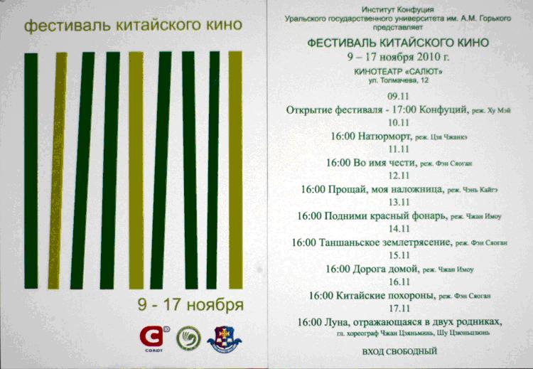 此次中国电影节由乌拉尔国立大学孔子学院主办,于11月9日至17日为期九天在影院共展映《孔子》、《集结号》、《霸王别姬》、《三峡好人》、《唐山大地震》等9部国产优秀影片。中国驻叶卡捷琳堡总领事馆科技文化领事张纪山、教育领事杨金玉、乌拉尔国立大学副校长弗拉基米尔•克鲁扎耶夫,孔子学院中方院长沈三山,俄方院长谢尔盖•斯米尔诺夫以及叶卡捷琳堡社会各界人士等参加了开幕式,并观看了展映影片《孔子》。