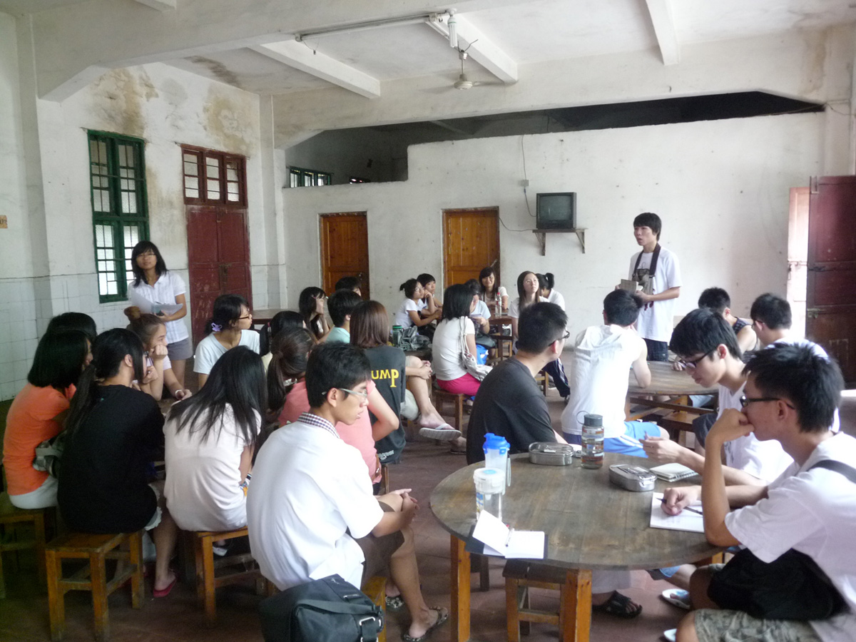“心夏乡”志愿者服务队由三十名来自09应用心理班的同学组成,由三十颗热情如火的心组成。我们满怀热忱来到大岗——位于肇庆怀集县的一个山城,刚下车我们就感觉到有别于城市的乡村气息,微风拂去面上的汗水,带来的是一份独特的清凉。而我们身上印着广外、政管标识和“VIVA SUMMER”字样的队服,更是吸引了不少行人的目光,一如我们带着好奇的目光打量着大岗一样。我们拖着行囊走进大岗中学,烈阳照耀在古朴的教学楼上,高大的树木青翠诱人,就在这儿,我们将带与大岗更多活力与生机。