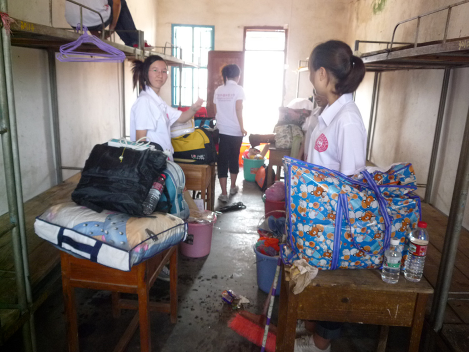 怀着忐忑,我们走上了宿舍楼,正如我们预料,宿舍的条件并不好,对于生活在大学城的同学,望着锈迹斑斑的铁床,我们知道,磨练我们吃苦耐劳的品性的时候,到了。拎起水桶,我们默默地下楼打水,着手打扫房间,因为,我们知道,“三下乡”是来传授知识的,而我们,将体验不一样的生活。
