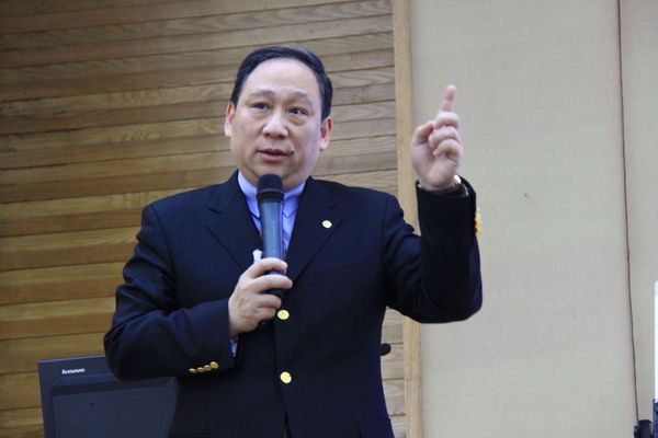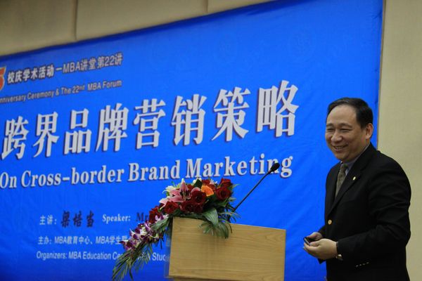 本网讯 11月14日下午,我校45周年校庆系列学术活动之一、MBA讲堂第22讲——跨界品牌营销策略在北校区图书馆负一层报告厅举行。此次讲座由广州新中华酒店物业管理有限公司董事总经理、星河湾地产控股有限公司副总裁,我校客座教授梁培当先生主讲,我校副校长陈德萍、MBA教育中心主任孟庆轩、执行主任孙建军出席了讲座。