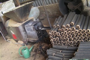 接下来他们又去了一个用木屑生产炭条的小加工场,了解到木屑正是木材加工的废料,可用来生产炭条,是废物再利用。