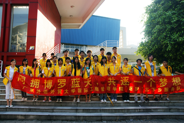 本网讯 2010年7月19日上午,广东外语外贸大学国际工商管理学院“逐梦”三下乡服务队在广外大中行前登上汽车,前往惠州市博罗实验学校。到校后,队员们入住学生宿舍并对教室进行打扫,揭开了三下乡社会实践活动的序幕。
