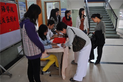 西语各语系校友座谈会于十点在四教准时开始,随着校友的到来,会议室,以及每个语系的办公室都其乐融融,在座谈会中,郑立华院长还用法语与法语系校友进行了亲切对话。