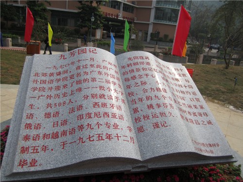 下午两点,九芳园的开幕仪式准时进行,校长仲伟合发表了重要讲话。接着一位校友讲述了九芳园的意义:亭子旁的梯阶刻着用各自的语言写成的英语,法语,德语,俄语,日语,印尼语,越南语,泰语,而刻着九芳园的石头前的五个花坛象征着70级学生的五年学制。最后,仲伟合,校党委书记隋广军以及当时各个系的代表揭开了石头上的红布,同时当时九个语种的校友代表在旁边放出了缤纷的彩带,达到了整个仪式的高潮,掌声迭起。