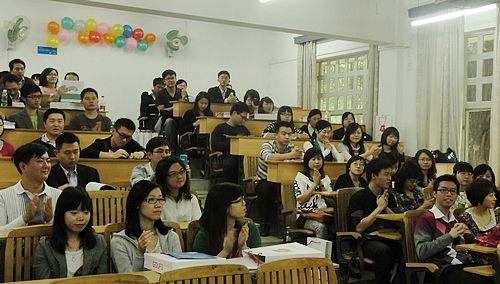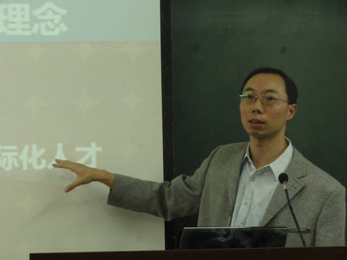 随后,校友们应邀前往三教101参加商英学院发展情况的介绍会。会上,谢应东首先代表全体领导班子和师生欢迎校友的到来。紧接着郭桂杭就学院办学理念、专业发展简史、师资队伍建设、学生发展情况和国际化人才培养等七个方面进行介绍。在学生发展方面,他着重介绍了商英学子优秀的学习成绩、丰富多彩的学术活动、专业的实习基地及广阔的就业前景,并衷心希望校友们能为学院提供更多的实习基地。接着,他还从创新办学理念、凸显全英教学特色、打造全英教学优势明显的师资队伍等方面简要介绍商英培养国际化人才的措施。最后郭桂杭诚挚邀请校友们在2011年返校参加十周年院庆。