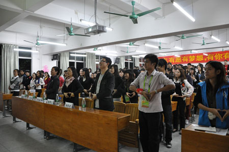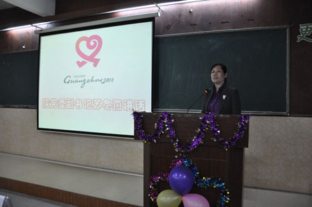 本网讯 11月4日晚,公开学院广州亚运会志愿者动员大会在第一教学楼212室举行。校团委副书记谢秀兰,公开学院党委副书记苏冬燕、商务英语系副主任钟振威及200多名志愿者出席了大会。会议由公开学院团委书记肖丽芳主持。