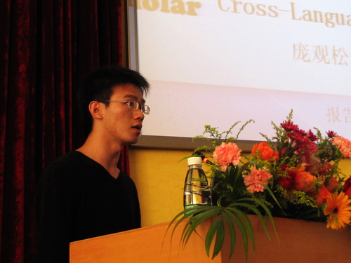 随后思科信息学院06级、现思科信息学院企业管理研一学生庞观松为观众展示了他们的“安利杯”获奖作品——CLI Scholar搜索引擎。庞观松简述了项目的研发背景并通过亲自为观众试用CLI Scholar详细地讲解了该搜索引擎的特点和优势。