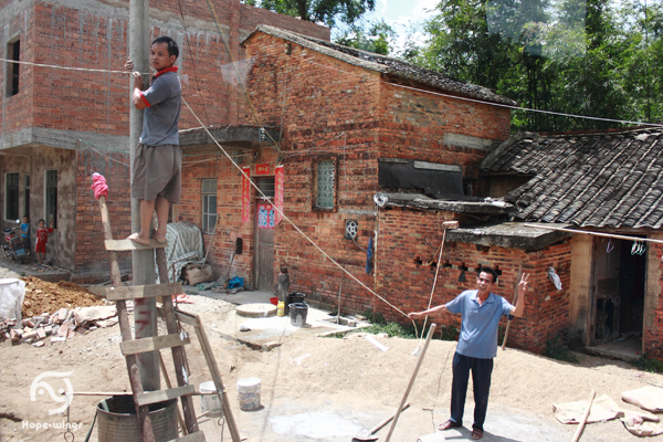 电线架高后,校长(右)摆出了胜利的手势