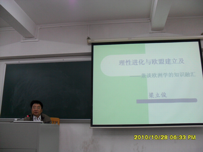 本网讯 10月28日晚,由科研处举办、欧洲研究中心承办的45周年校庆学术讲座暨“欧洲论坛”十四期在北二教207开讲。欧洲学硕导梁立俊博士以理性进化的角度,从欧洲的历史、欧盟的建立娓娓道来,视角新颖、观点独特,吸引了09级、10级欧洲学硕士以及其他学院的大四同学的参加。