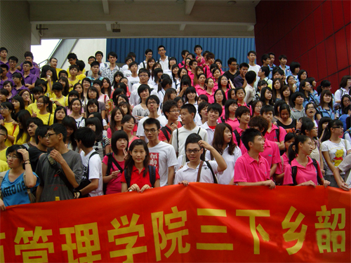 本网讯 7月18日7时,广东外语外贸大学国际工商管理学院三下乡队伍在中行门口集合,并留影纪念。8点,仁知09三下乡服务队20名队员怀着激动的心情踏上了通往韶关新丰县三下乡的旅程。在经过4个小时的路途颠簸,我们终于来到了新丰县第二中学。