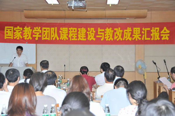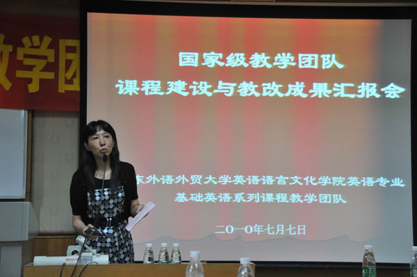 本网讯 2010年7月7日下午,英语语言文化学院在北校区第一教学楼201会议室召开“英语专业基础英语系列课程国家级教学团队课程建设与教改成果汇报会”。校党委副书记陈建平、副校长刘建达、教务处长詹文都、研究生部主任曾用强、教务处副处长范正华、英文学院党政领导班子、教学团队全体成员以及担任英语专业一、二年级教学的全体任课教师出席了会议。