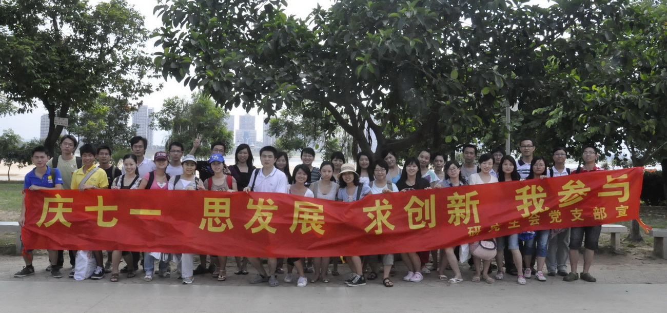 本网讯 研究生会党支部以“庆七一、思发展、求创新、我参与”为主题的党日活动于7月10日在清远江滨公园举行。研究生会党支部成员(含研究生会、研究生团委、语言学习与跨文化培训中心)及非党员干部一行44人参加了此次主题党日活动。研究生会党支部书记苏高阳出席。