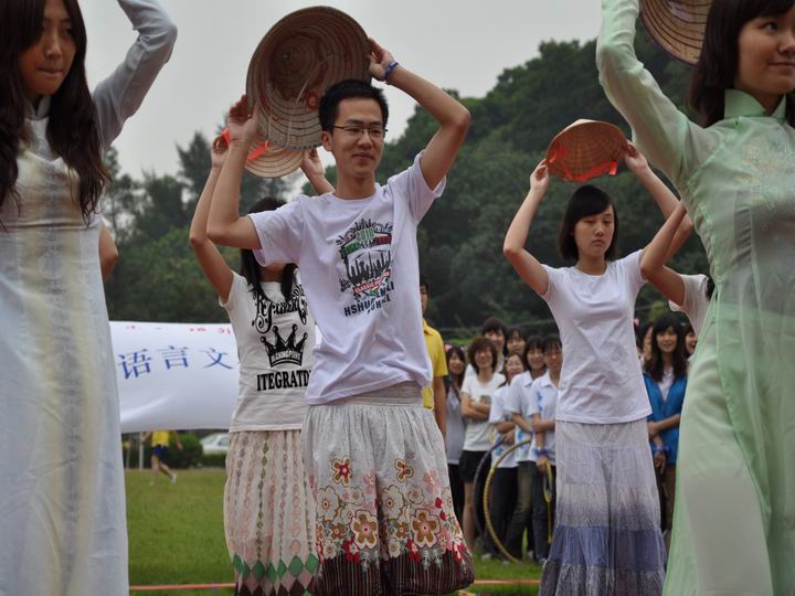 在即将开幕的第16届亚运会的大背景下,09的学子们在开幕式表演中特意增加了亚运的元素:有的班级舞蹈富含动感与活力,意指“激情盛会”;有的班级则以东南亚风情的舞蹈阐释“和谐亚运”。其中,印尼语班变换四种不同风格的音乐,将古典风与流行风、中国风与外国风交织融合在一起,恰与和谐融合多民族的亚运盛会主题相呼应;而越南语班则用那舞动的斗笠、飘扬的裙摆,为观众献上了别开生面的越南舞蹈。