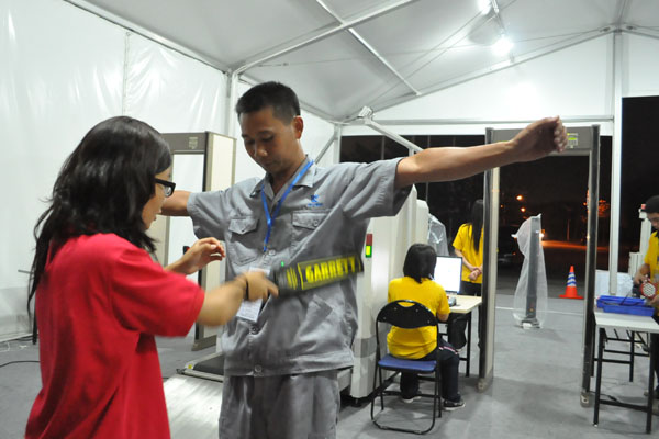 在安检方面,安检副经理提到人员及车辆的通过要求:“进场人员要进行人、物分检。随身物品,例如手机、钱包等要人手检查,而大件的物品要经过X光机的检测。比赛期间我们还设有脚底的探测,免去了脱鞋检查的麻烦。除了免检车外,所有车辆都要接受车厢、车底的安检才能通过。”而当发现携带易燃易爆、毒品、刀具、打火机、饮料等违禁品时,工作人员会对这些物品进行收缴,并把相关人员带到临时检查点安检。对比赛构成影响的人员,会进行治安审查。记者在现场也看到进场人员如果被探测到身上有金属物品,就要到旁边进行人手搜探。而通行车辆的司机也要下车到旁边接受检查。