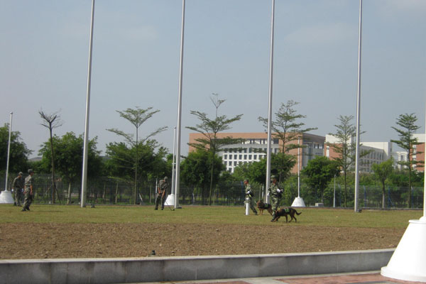 本网讯 10月17日上午,广州军区工兵和武警部队等80余名特警在广东外语外贸大学的亚运场馆进行搜爆行动,为即将举行的广州亚运会保驾护航。我校基建处处长王新贵,后勤部副部长杨思,广外亚运场馆保障部经理王鲁江,综合事务经理肖锋和安检经理陈淦民亲临现场视察。