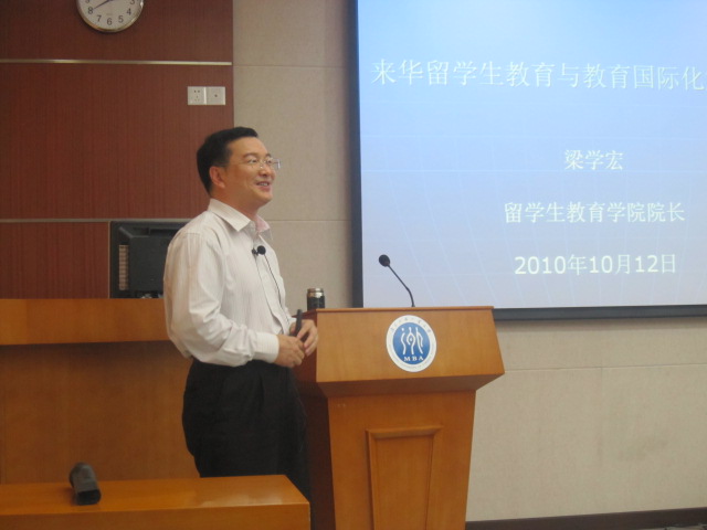 本网讯 10月12日下午,我校45周年校庆系列学术讲座之“来华留学生教育与教育国际化发展战略”在北校区六教MBA中心106室举行。留学生教育学院院长梁学宏就来华留学生教育的发展概况、我校教育国际化发展战略以及我们所面临的机遇、挑战、问题及我们应采取的对策进行了深入的分析。