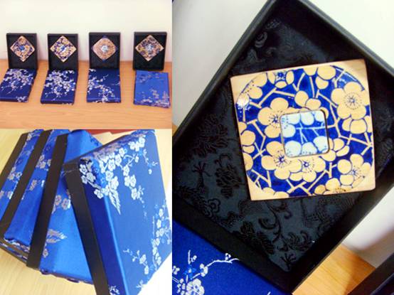 张燕萍、谢夏雨等同学设计制作的青花瓷嵌木板手绘系列礼品
