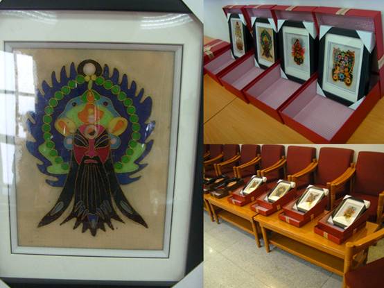 孙喆、刘天球、邱斌、赖俊敏等同学制作彩砂嵌丝脸谱礼品
