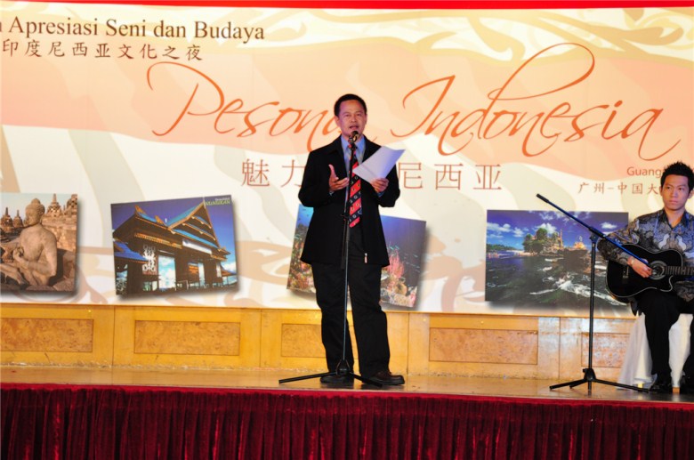 Edi Yusuf在晚宴上致辞,此次晚宴旨在向广州民众展示一个真实的印度尼西亚,一个拥有异彩纷呈的文化艺术和丰富的旅游资源的印度尼西亚。广州民众可以更直接地了解印尼,并在增进了解的基础上到印尼旅游,亲身体验印尼的魅力之旅。2010年是中国与印尼建交60周年,他也希望借此活动欢庆两国的友谊之年,促进中国和印尼两国的文化交流与合作。最后,在第十六届亚运会即将到来之际,Edi Yusuf代表印尼政府预祝广州亚运会举办成功。