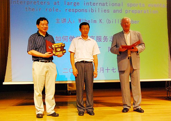 在讲座过程中,他指出作为体育赛事的口译人员,不仅要拥有良好的专业知识,还必须在赛前对各种体育赛事规则的目标语言进行熟悉,另外对目标语言国家的文化也必须有深入的了解。韦伯作为一个精通六种语言的资深口译官,在比赛前他每天都要看不同语言的报纸及各类出版物,以保证在翻译时能够做到像说母语一样地流利自然。