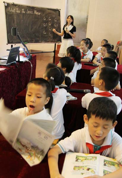 在张秀琴老师执教小二3班的生本英语课《The Lion’s Mirror》上,小组成员分角色争先进行课本剧表演,人人都能流利地说着不同角色的对话,课堂气氛异常活跃,学生学习兴趣浓厚,享受着生本英语给他们带来的极大乐趣。