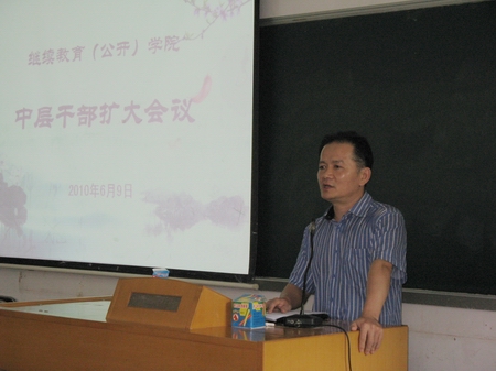 本网讯 为了深入贯彻大学与学院关于加强干部素质建设的精神,进一步拓宽我院办学工作思路,本学期,我院与相关兄弟院校开展了系列调研活动。6月上旬,学院专门委派副院长陈国兴、副书记苏冬燕赴北京外国语大学继续教育学院(以下简称北外继教院)进行学习和交流。6月9日下午,在校本部三教216室,学院组织全体中层干部听取调研成果报告,陈国兴与大家一起分享了调研心得和体会。会议由学院院长何勇斌主持,学院领导和中层干部均出席了会议。