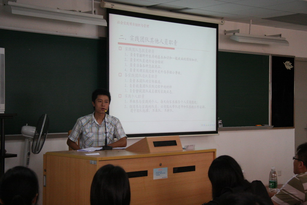首先,曾继平老师为大家作了暑期“三下乡”社会实践专题培训讲座。讲座中,他详细说明了实践团队中队长及成员的职责以及“三下乡”前中后期的一些注意事项,并特别提醒队长们在“三下乡”开展调研时,要本着时效性、创新性、现实需求性等原则,多与学院的专业老师沟通,邀请他们对队伍的调研活动进行专业指导,争取做出有实用价值的调研报告。