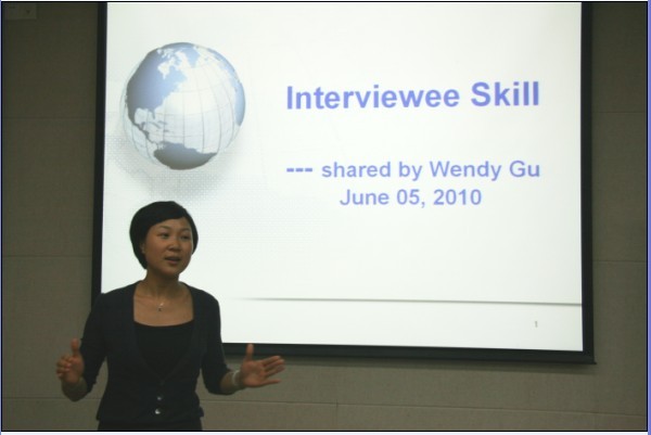 在随后的role play环节中,顾玉芸组织了一次模拟面试。她邀请现场的Sunny同学做interviewee, 自己做interviewer,让现场人员针对面试过程中的问题进行点评。Sunny是某知名银行的行长助理,针对“面试官”抛出的几个问题,她反应迅速,应答自然,得到了顾玉芸的好评。同时,顾玉芸也建议Sunny,应更注重细节问题,使自己的风格更加柔和。
