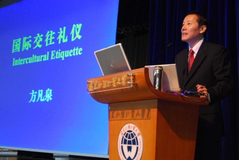 方凡泉一开场就以自身形象诠释了得体着装的必要性与重要性。他指出,中西交往和礼仪有着大相径庭的问候语、截然不同的宴请语、泾渭分明的送礼礼仪等,掌握不同国家的礼仪特点,有助于更好地与外国友人沟通和交往。在“国际交往礼仪”的讲解中,方凡泉主要阐述了以下七个方面:着装、仪容、座次排序、交谈礼节、公共场所礼节、送礼的礼仪。
