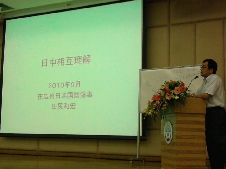 本网讯 9月9日下午2点,由日本国驻广州领事馆总领事田尻和宏主讲的“中日相互理解”讲座在北校图书馆报告厅举行,东语学院长韦立新、日语系副主任刘劲聪、讲师杨晔等出席了此次讲座,日语系08、09级全体学生参加。