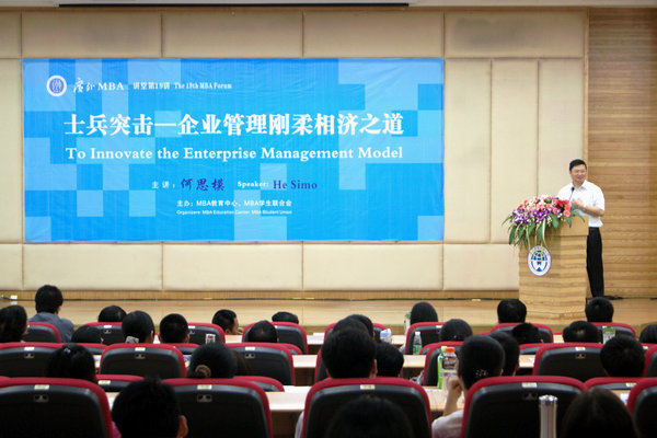 本网讯 “MBA是学什么的?很多人说是(管理)技能,我说是学一种心态。”9月12日下午,北校图书馆学术报告厅迎来了MBA讲堂的开学第一讲,广东易事特电源股份有限公司和东方集团董事长何思模带来了题为“士兵出击——企业管理刚柔相济之道”的讲座,分享了自己如何通过近军事化管理与企业管理相结合的模式,发展出一个庞大的集团。