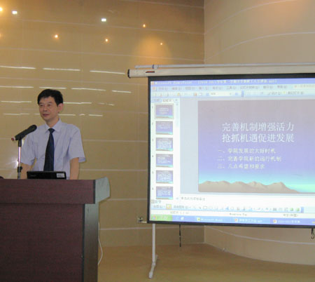 院长何勇斌首先进行题为“创新、质量、品牌”的新学期工作布置报告。他代表院领导向全体教职工表达新学期的诚挚问候,并对学院上半年的工作情况予以肯定。展望新的学期,何勇斌指出,学院要坚持以“创新、质量、品牌”引领工作,通过深化改革、完善运行机制,增强学院的活力与市场竞争力;通过科学、规范的管理和优质的服务,提高教育教学质量,扩大学院的品牌影响力。