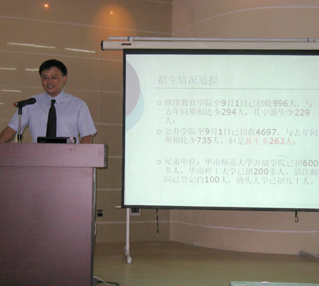 继教(公开)学院自上学期开始进行运行机制改革,经过一个假期的运作,虽然新机制还有待进一步的完善和改进,但新机制带来的工作成效也已慢慢显现,体现在:一是教职工的工作积极性、主动性进一步提高,学院各部门的教职工更关注学院的发展,并以实际行动积极支持学院的发展;在刚刚结束的暑期里,学院很多部门和教职工都没有休息,积极投身于学院的招生、咨询工作。二是经过大家的共同努力,虽然今年因为客观因素的影响(普高招生录取分数一降再降,给全省及至全国继续教育的招生造成很大的压力),但在其他同类院校招生不甚理想的情况下,截至9月1日,我院公开学院的新生招生数仍比去年同期增加263人。