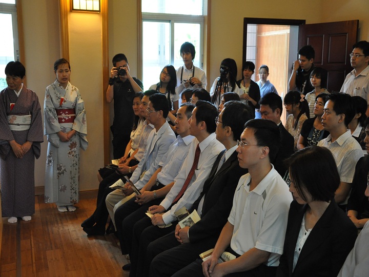 本网讯 6月5日,“日本里千家茶会”在我校一教日本茶室举行。此次茶会由日本驻广州总领事馆与我校共同举办,旨在纪念2009年4月22日“日本利民工程”无偿援助项目“佳乐庵茶室”落成一周年。参加这次茶会的日方嘉宾有日本驻广州总领事馆领事田尻和宏总领事及其夫人,首席领事小松道彦先生,驻广州日本商工会事务局副局长田中康之,日本妇女会向裕美会长等。中方嘉宾有广东省人民政府外事办公室处长余顺荣,广东省人民政府对外友好协会副秘书长陈广海,我校副校长方凡泉,东方语言文化学院书记林绍雄,日语系副系主任刘劲聪老师等。茶会还吸引了南方都市报、新快报、广州电视台等新闻媒体进行采访报道。茶会上,里千家茶道驻中国主任坂井晴美老师及驻天津的市川宗弘老师同几位弟子进行了茶道表演。