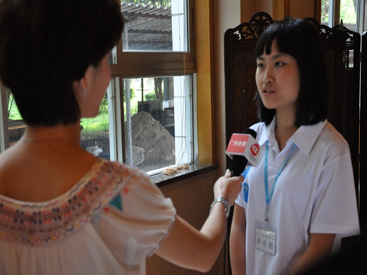 茶会开始前,坂井晴美老师接受了广州电视台竞赛台记者的采访。坂井表示,很高兴“茶”能成为中日文化交流的一座桥梁,茶源于中国,在日本有了不同的变化和发展。她希望能通过茶文化的交流,加深彼此之间的了解。东语学院中日文化交流小组的组员舒亦庭同学在接受电视台采访时介绍了平日在茶室工作及学习日本传统文化的感想,她这样说道:“在这个交流小组中不仅学到了不少日本传统文化的精髓,还加深了对日本文化的理解,也使我们认识到再认识自己国家传统文化的必要。”
