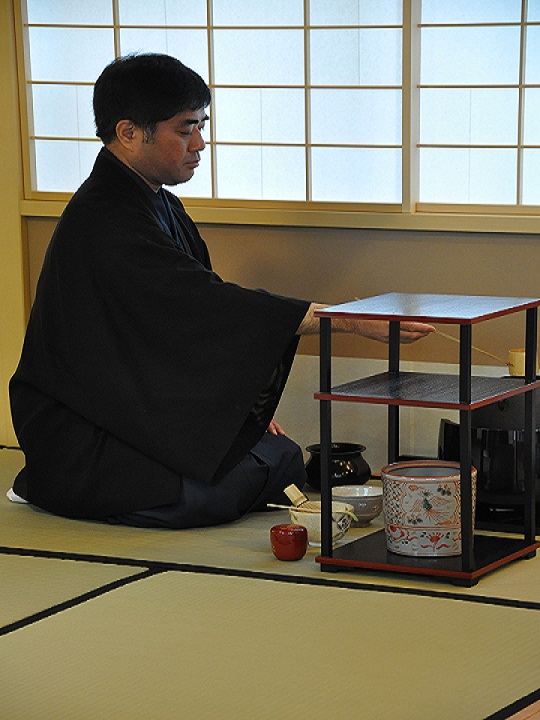 茶道表演随之拉开帷幕,坂井老师娓娓道来介绍茶道艺术,市川宗弘老师开始点茶(茶道中泡茶的过程叫点茶)。茶室内灯光柔和,在和服衣摆摩擦的沙沙声和足袋(日式白短袜)与榻榻米摩擦的刷刷声中,主人有条不紊,气定神闲,庄重优雅地演示着茶道艺术,在座嘉宾无不沉醉于浓郁的东瀛茶文化之中。细细品茗后,嘉宾们对主人精湛的点茶技艺以及色鲜味浓的抹茶赞不绝口。第一场茶会在热烈的掌声中结束。