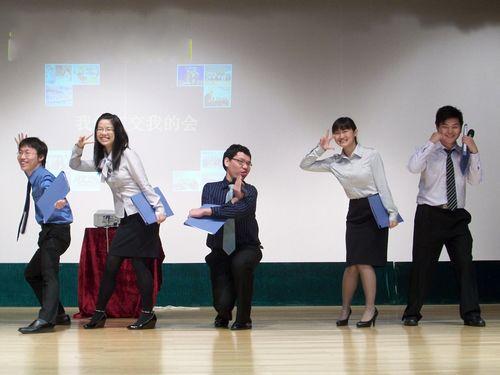 随后的节目表演可谓精彩纷呈,妙趣横生。开场的catwalk秀点燃了现场的气氛。第一组男模特西装革履,女模特白领正装,展示了商英学子的职场魅力,尽显专业素质;另一组模特通过活泼轻松的走秀为观众重现了办证处、车辆安排等系列趣事的场景;接下来的一段趣味视频,通过专业风采、苦中作乐以及爱与记忆三部分内容回顾了广交会各区工作岗位的细节。