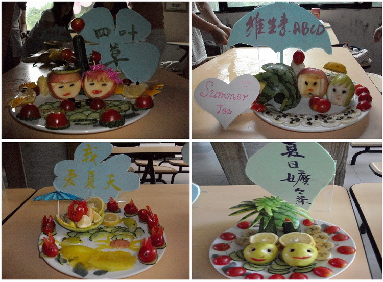 其中,来自商英学院的参赛队伍“四叶草”,设计巧妙,刀法娴熟,配合到位,西瓜、柠檬、圣女果、黄瓜在他们的创意下组成了一盘“全盘热恋”的景象,并以此赢得评委和观众的一致好评,从所有参赛队伍中脱颖而出,捧走冠军。二等奖由商英学院的“夏日嬷嬷茶”队获得。此外,值得一提的是欧洲研究中心的“果然是你”参赛队伍,虽然只有三名组员,而且两名是男生,但是也不甘示弱,设计的作品“凤鸣岭南”,把校歌表现得生动形象,从而揽走季军。